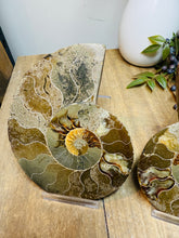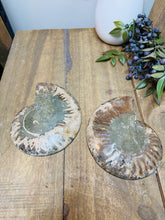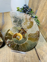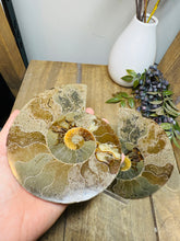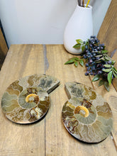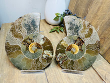 These fossils consist of an Ammonite cut in half and polished to create a gorgeous pair. This matching pair have been cut in half and then polished on one side to reveal it's generous colours, internal caves and patterns.