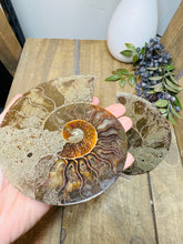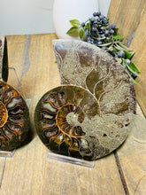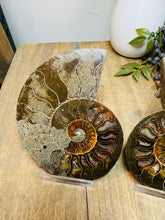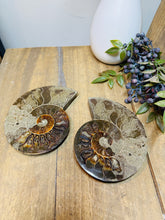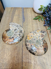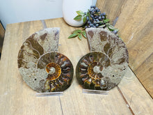 These fossils consist of an Ammonite cut in half and polished to create a gorgeous pair. This matching pair have been cut in half and then polished on one side to reveal it's generous colours, internal caves and patterns.
