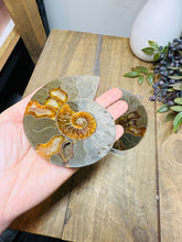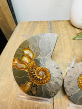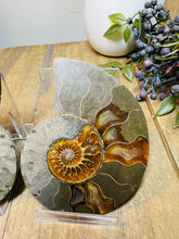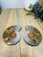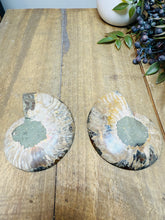 These fossils consist of an Ammonite cut in half and polished to create a gorgeous pair. This matching pair have been cut in half and then polished on one side to reveal it's generous colours, internal caves and patterns.