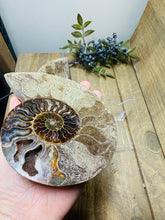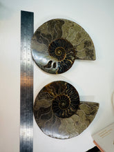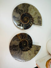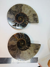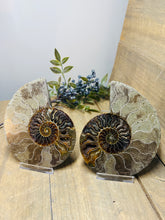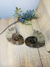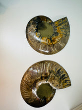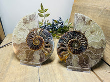 These fossils consist of an Ammonite cut in half and polished to create a gorgeous pair. This matching pair have been cut in half and then polished on one side to reveal it's generous colours, internal caves and patterns.