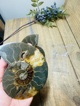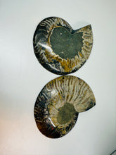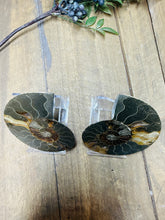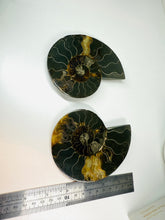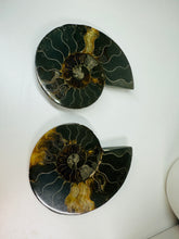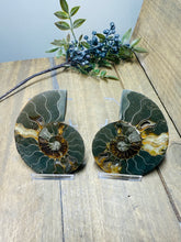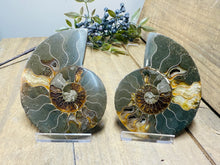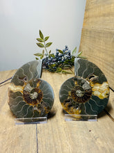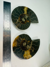 These fossils consist of an Ammonite cut in half and polished to create a gorgeous pair. This matching pair have been cut in half and then polished on one side to reveal it's generous colours, internal caves and patterns.