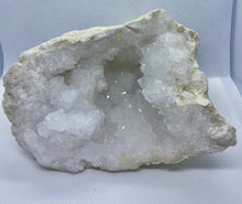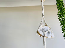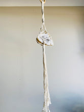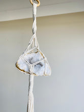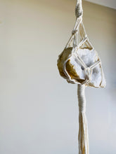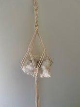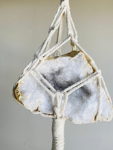 Macramé wall hanging featuring a Quartz Crystal Geode. Can be hung from the ceiling or the wall. Hand made with natural macramé. This item will perfectly compliment any living room, or bedroom and is a unique way to display natural crystals in the home.