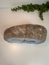 Polished Natural Agate book ends. These book ends are a natural stone, cut in half, and then polished to reveal naturally occurring patterned rings, geodes and crystals inside. These bookends are truly unique as they can be used in different directions (see photographs where it changes the look).