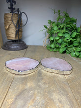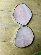 Rose Quartz slice drink coasters with silver electroplating around the edges.